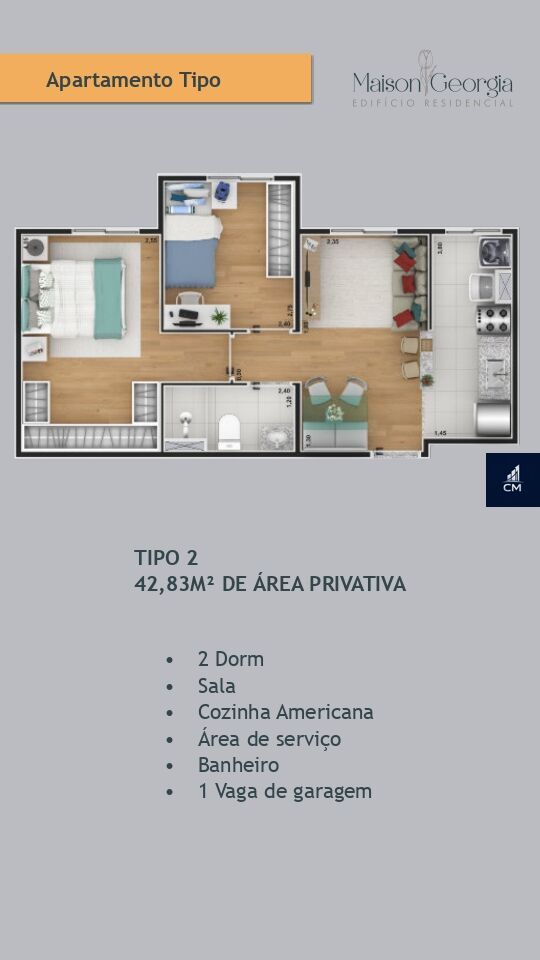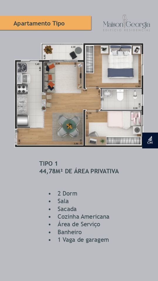 2 Dormitórios, sendo 1 suíte1 Banheiro1 Vaga1 Sala de TV1 Cozinha1 Sala de jantar1 Sala de estar1 Área de serviço