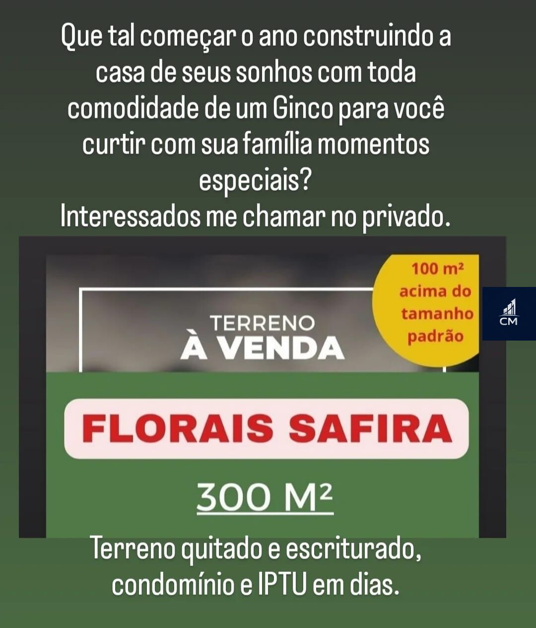 Não perca tempo! A combinação de um lote de 300m² , quitado/escriturado e a infraestrutura completa do Florais Safira é a chance que você esperava.